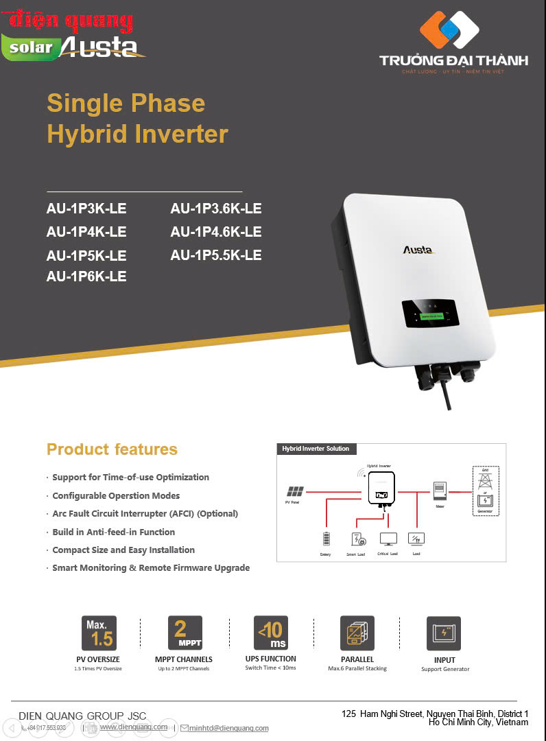 Sản phẩm này có chức năng chuyển đổi dòng điện một chiều (DC) được tạo ra từ các tấm pin năng lượng mặt trời thành dòng điện xoay chiều (AC) – dòng điện có thể sử dụng trực tiếp trong sinh hoạt hàng ngày hoặc cho các thiết bị điện công nghiệp. Với thiết kế công suất đầu ra 5kW, tích hợp hai bộ theo dõi điểm công suất tối đa (MPPT) cùng nhiều tính năng thông minh, biến tần 5kW là lựa chọn lý tưởng, đáp ứng hoàn hảo nhu cầu sử dụng điện cho cả hộ gia đình lẫn cơ sở kinh doanh quy mô nhỏ.